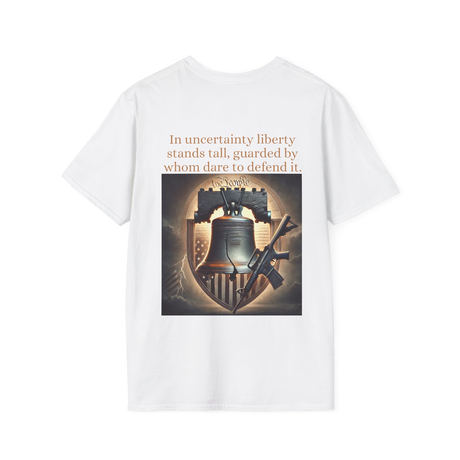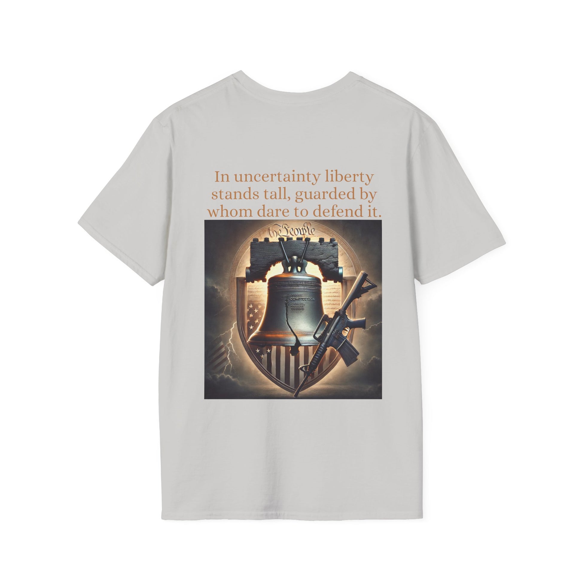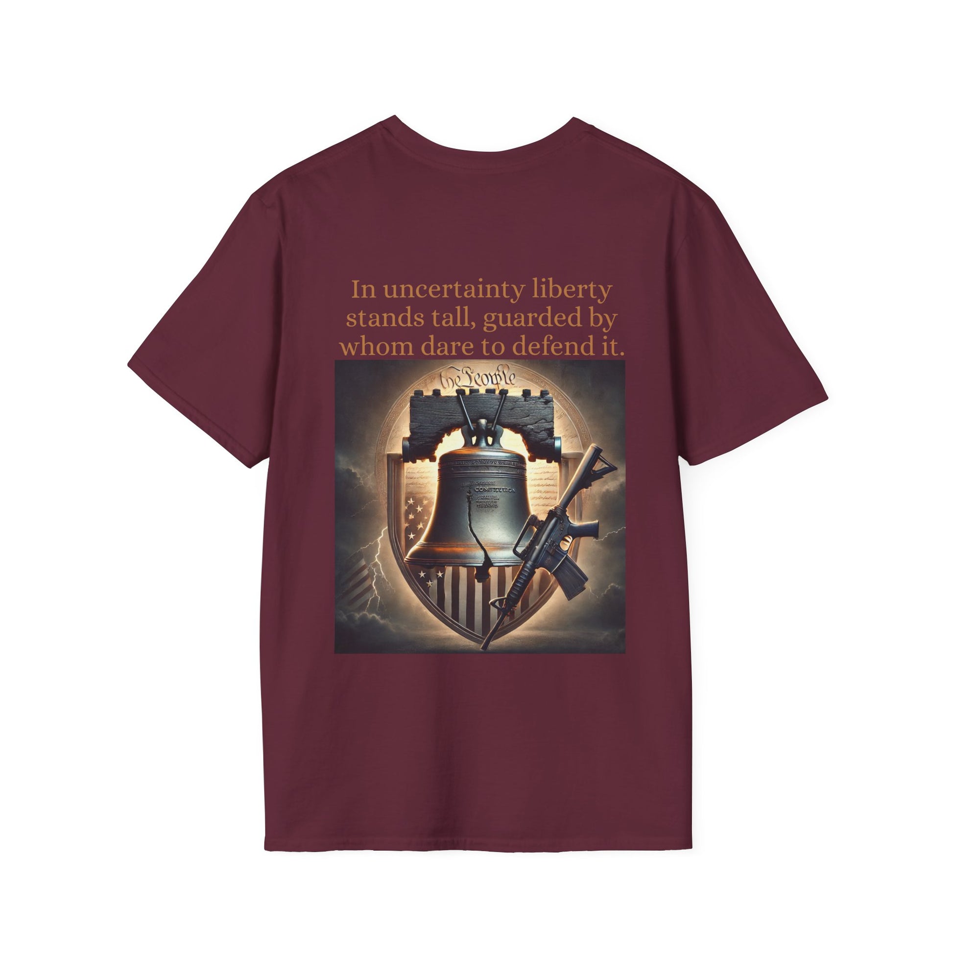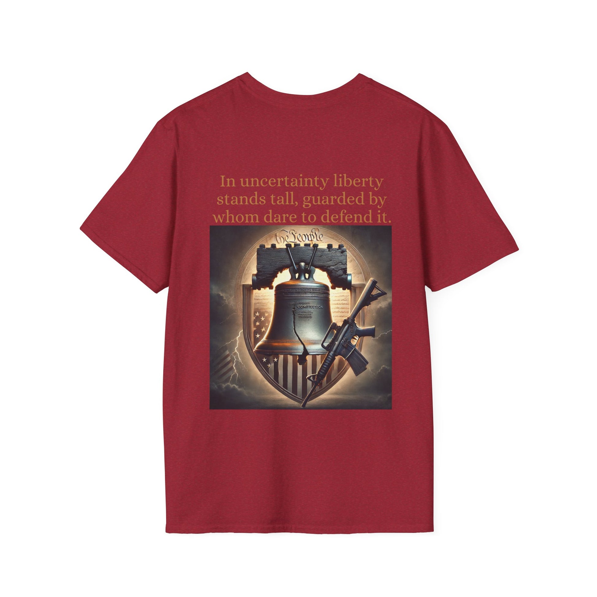 A patriotic and bold T-Shirt design that speaks to the defense of liberty. This versatile and comfortable T-Shirt is perfect for anyone who values freedom and patriotism. It can be worn all year round and is ideal for holidays like Independence Day and Memorial Day.