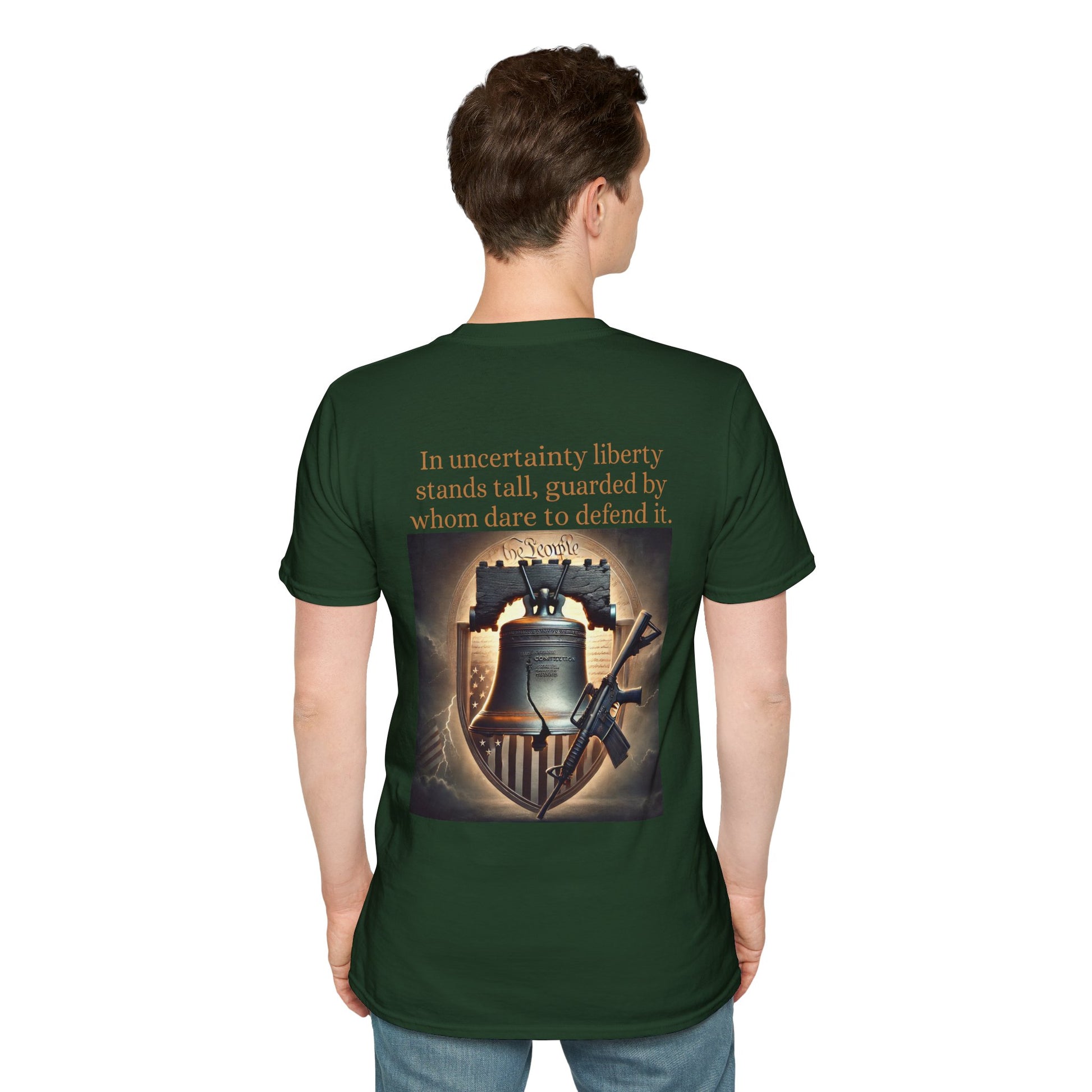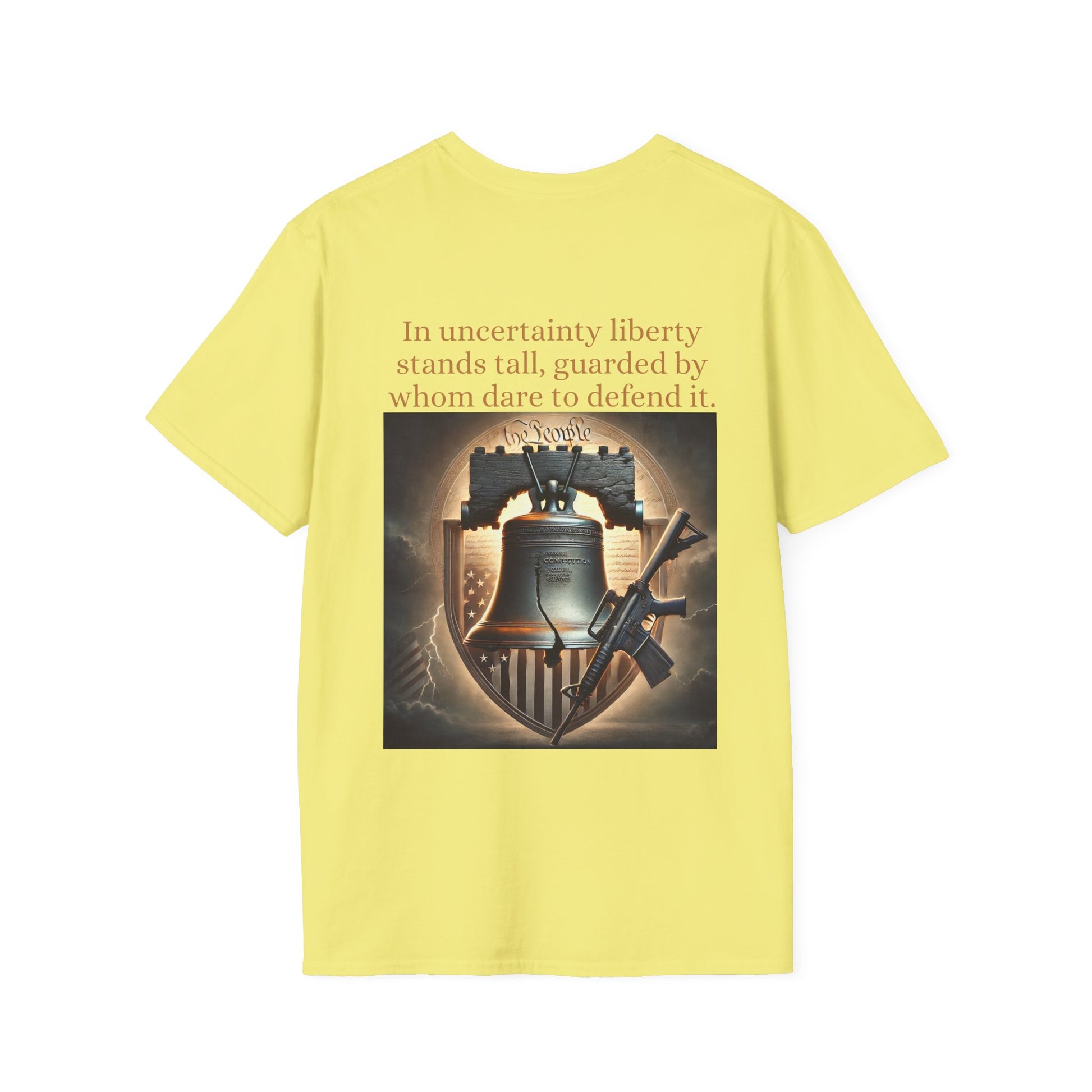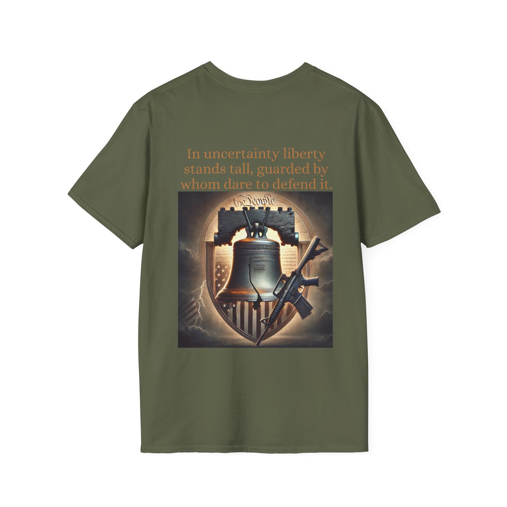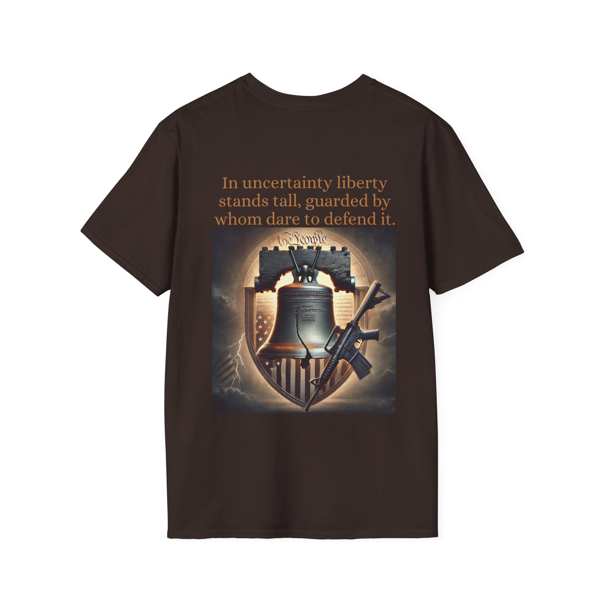 A patriotic and bold T-Shirt design that speaks to the defense of liberty. This versatile and comfortable T-Shirt is perfect for anyone who values freedom and patriotism. It can be worn all year round and is ideal for holidays like Independence Day and Memorial Day.